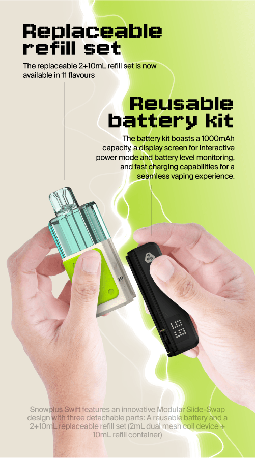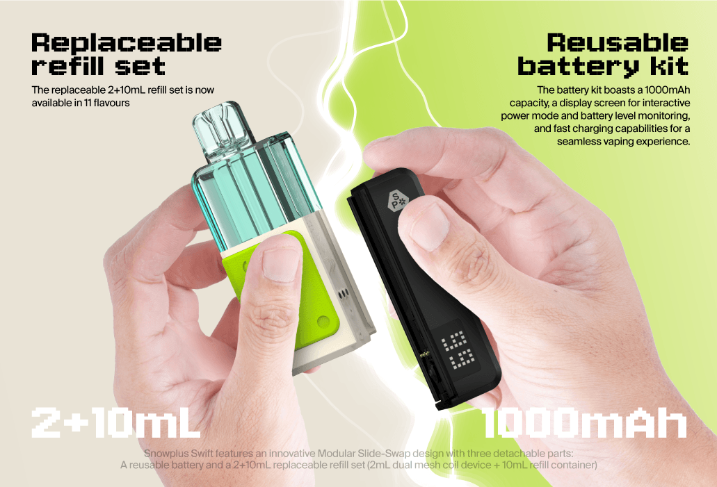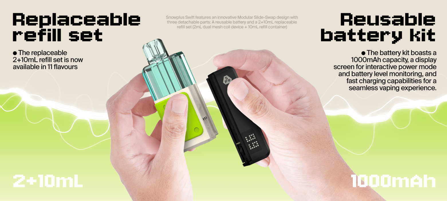 The product includes: Reuseable battery, replaceable 2+10ml refill-set